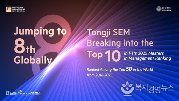 복지경영뉴스 이명수 기자 | 상하이, 중국 2025년 9월 10일 -- 파이낸셜 타임스(Financial Times)가 9월 8일 '2025년 글로벌 경영학 석사 순위(2025 Global Master in Management Ranking)'를 발표했다. 이 순위에서 퉁지대학교 경제경영대학(Tongji University School of Economics and Management, 이하 Tongji SEM)이 세계 8위로 처음으로 글로벌 상위 10권에 진입했으며 4년 연속 상위 25위권을 유지하는 쾌거를 이뤘다.