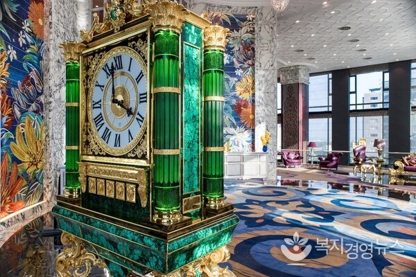 7층 로비에 들어서면 에메랄드빛 공작석으로 제작된 3미터 높이의 발디(Baldi) 기념 시계와 5미터짜리 24K로 도금한 콜롬보스틸(Colombostile) 소파가 호화롭고 웅장한 분위기를 연출한다.
