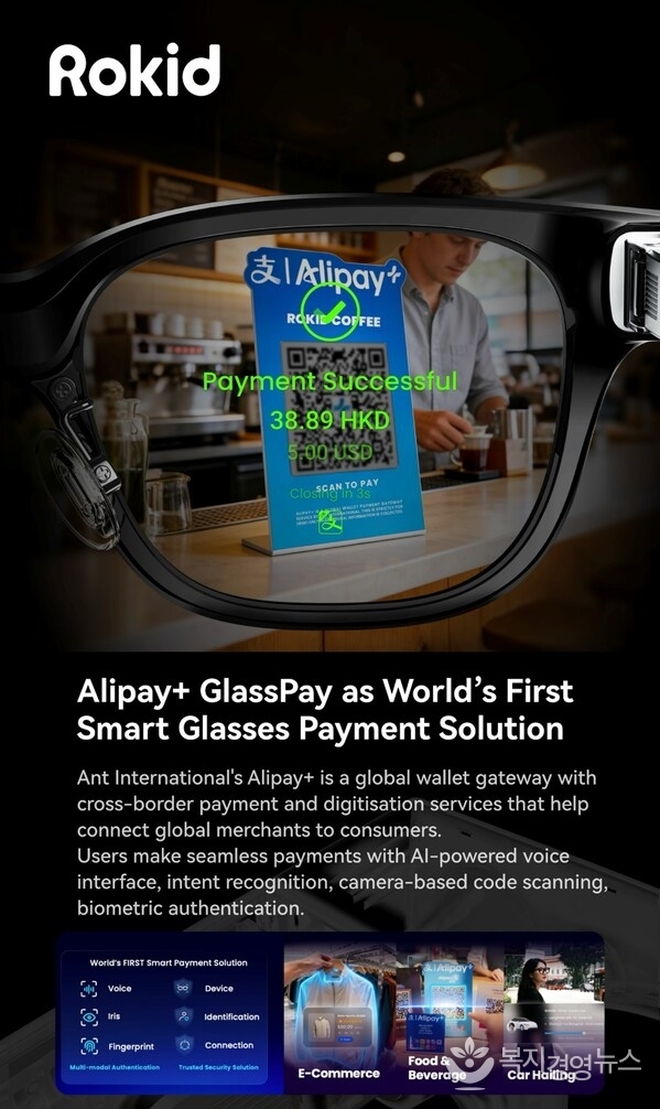 복지경영뉴스 이명수 기자 | 라스베이거스 2026년 1월 9일 -- 인간과 컴퓨터 간 상호작용과 증강현실 분야를 선도하는 기업 로키드(Rokid)가 글로벌 디지털 결제, 디지털화 및 금융 기술을 선도하는 기업 앤트 인터내셔널(Ant International)과 전략적으로 협력하여 최근 CES 2026에서 전 세계 최초로 공개된 세계 첫 오픈 생태계 AI 스마트 글래스 Rokid Glasses와 Rokid Ai Glasses Style에 결제 기능을 탑재한다고 밝혔다. 이는 AI 기반 웨어러블 기술의 실제 활용 분야를 확대하기 위한 포석이다.