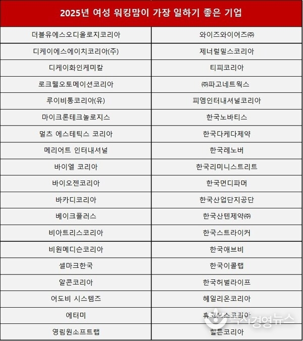2025년 대한민국 여성 워킹맘이 일하기 좋은 기업에 선정된 기업들은 여성 워킹맘이 일하기 좋은 조직문화와 제도를 조성해 왔으며, 이를 통해 기업의 생산성과 직원의 만족도를 높이는 데 성공했다. 이번 '2025년 대한민국 여성 워킹맘이 일하기 좋은 기업'에 선정된 기업들은 아래와 같다.