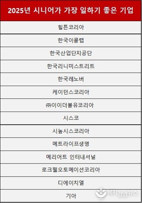 2025년 선정된 기업들은 시니어 직원들을 배려한 정책과 프로그램으로 조직 내 신뢰와 존중 문화를 형성했다는 점에서 높은 평가를 받았다. '2025년 대한민국 시니어가 가장 일하기 좋은 기업은 다음과 같다.