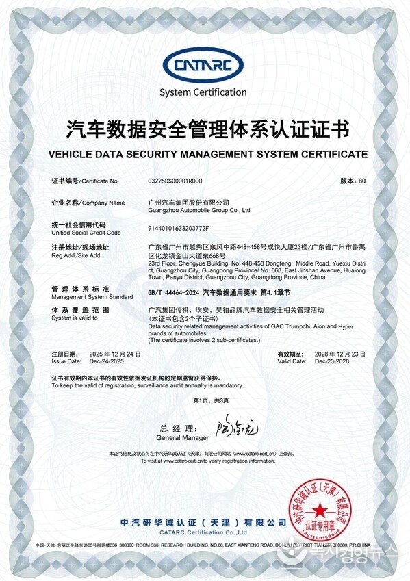 복지경영뉴스 이명수 기자 | 톈진 및 광저우, 중국 2026년 1월 1일 -- GAC가 12월 24일 업계 최초로 차량 데이터 보안 관리 시스템 인증(Vehicle Data Security Management System Certification, 인증서 번호: 03225DS00001)을 획득하며 차량 데이터 보안 분야에서 공식적으로 다시 한번 인정받았다. 이번 성과는 GAC가 업계에서 체계적인 데이터 보안 구축을 선도하고 있음을 보여주는 것으로, 지능형 커넥티드 시대의 자동차 데이터 거버넌스에 대한 새로운 기준을 제시한다.