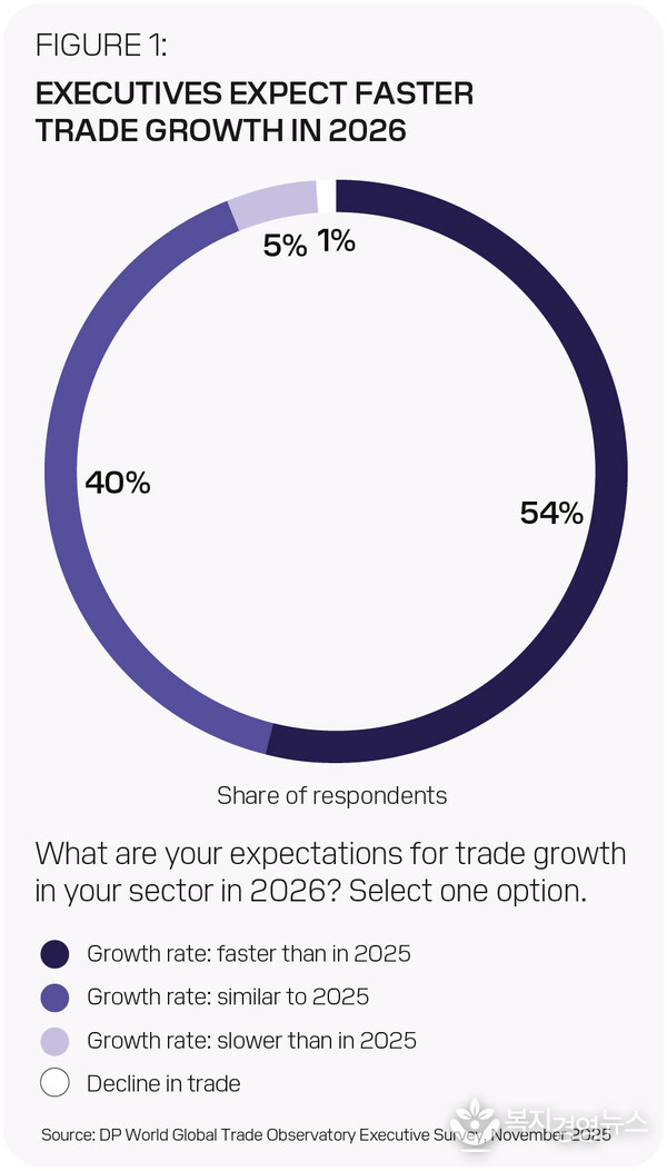 다보스, 스위스, 2026년 1월 21일 -- 글로벌 무역 전망은 취약해 보이지만 비즈니스 신뢰도는 그렇지 않다. 이는 DP 월드(DP World)의 신간 글로벌 무역 관측소(Global Trade Observatory, GTO) 2026 연례 전망 보고서(Annual Outlook Report 2026)의 요점으로, 응답자의 94%가 마찰과 변동성 증가에도 불구하고 2026년도 무역 성장세가 2025년도와 비슷하거나 이를 상회할 것으로 예상했다.