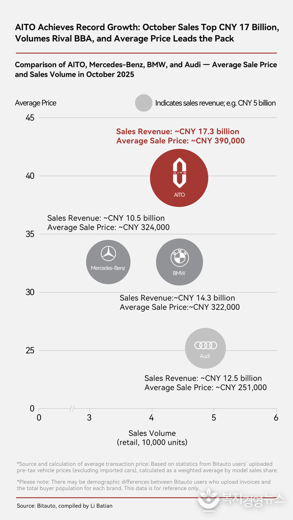 판매 실적 외에 아이토의 우수한 브랜드 평판과 높은 차량 잔존가치 역시 강력한 시장 성과를 지속적으로 뒷받침하고 있다. 아이토는 중국 자동차 시장조사기관 랜드로드(LandRoad)의 신에너지차 브랜드 지수(New Energy Vehicle Brand Index)에서 BMW와 아우디 등 전통적인 럭셔리 브랜드를 앞질렀다. 아이토는 또 평균 차량 가격이 40만 위안으로 BBA 그룹(BMW, 벤츠, 아우디)을 제치고 중국을 대표하는 럭셔리 자동차 브랜드로 도약했다. 판매 규모뿐만 아니라 브랜드 인지도, 고객 신뢰, 가치 측면에서도 아이토가 확고한 우위를 확보했고 안목 있는 소비자들의 최우선 선택지로 자리 잡았음을 보여주는 대목이다.