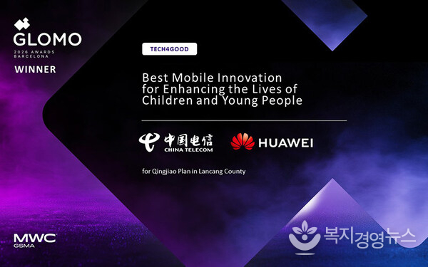 복지경영뉴스 이명수 기자 | 바르셀로나, 스페인 2026년 3월 11일 -- 화웨이(Huawei)와 차이나텔레콤(China Telecom)이 중국 란창현에서 진행 중인 칭자오 플랜(Qingjiao Plan)의 프로젝트로 MWC 2026 바르셀로나(MWC 2026 Barcelona)에서 열린 GSMA 글로모(GSMA GLOMO) 시상식에서 테크포굿(Tech4Good) 부문 어린이와 청소년의 삶 개선을 위한 최우수 모바일 혁신(Best Mobile Innovation for Enhancing the Lives of Children and Young People) 상을 받았다.