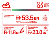 복지경영뉴스 이명수 기자 | 2025년 1~9월 연결 매출 535억 디르함으로 전년 동기 대비 25.3% 증가 2025년 1~9월 연결 순이익 118억 디르함으로 전년 대비 39.7% 증가 그룹 전체 가입자 수 2억 220만 명 돌파 아부다비, 아랍에미리트, 2025년 10월 30일 -- e&가 2025년 3분기 연결 기준 매출이 전년 동기 대비 29.2% 증가한 186억 디르함(AED)을 기록했다고 발표했다. 2025년 1~9월 누적 연결 매출은 535억 디르함으로, 전년 동기 대비 25.3% 증가했다. 이는 그룹의 탄력적인 비즈니스 모델과 상반기 역대 최고 실적을 바탕으로 성장을 지속할 수 있는 역량을 반영한다. 그룹은 전 사업 부문에서 강력한 성장세를 유지했다. 3분기 연결 순이익은 30억 디르함을 기록했으며, 1~9월 누적 연결 순이익은 118억 디르함으로 전년 대비 39.7% 증가했다. 3분기 EBITDA(감가상각 전 영업이익)는 전년 대비 29.2% 증가한 84억 디르함을 기록하며 마진율은 45.0%를 나타냈다. 2025년 1~9월 누적 EBITDA는 238억 디르함으로 전년